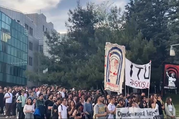 İstanbul — İTÜ öğrencileri, Rektörlük tarafından yaklaşık 20 gün tutuklu kalan arkadaşları Berkant Tatlı ve Seçil Murtazaoğlu’na destek amacıyla bir araya geldi. Öğrenciler, “Kayyumlar gidecek, biz kalacağız” sloganı nedeniyle hakkında soruşturma açılmasına tepki göstererek MED çimlerinde toplandı ve Rektörlük binası önüne yürüdü. Eylemde, soruşturmayı protesto eden pankartlarını Rektörlük kapısına bırakarak basın açıklaması yaptılar.