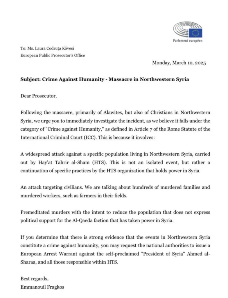 Kuzeybatı Suriye’deki olayların insanlığa karşı bir suç oluşturduğuna dair güçlü kanıtlar olduğunu tespit ederseniz, ulusal yetkililerden kendini ilan eden “Suriye Devlet Başkanı” Ahmed el-Şara ve HTS içindeki tüm sorumlular hakkında bir Avrupa Tutuklama Emri çıkarmasını talep edebilirsiniz.