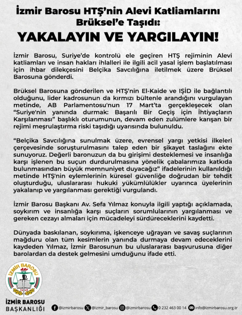 İzmir Barosu, Suriye’de çıkan iç savaş sonrasında emperyalist devletlerin güdümünde yönetimi ele geçiren HTŞ çetelerinin Alevi Soykırımı ve insan hakları ihlalleri ile ilgili acil yasal işlem başlatılması için ihbar dilekçesini Belçika Savcılığına iletilmek üzere Brüksel Barosu’na gönderdi.