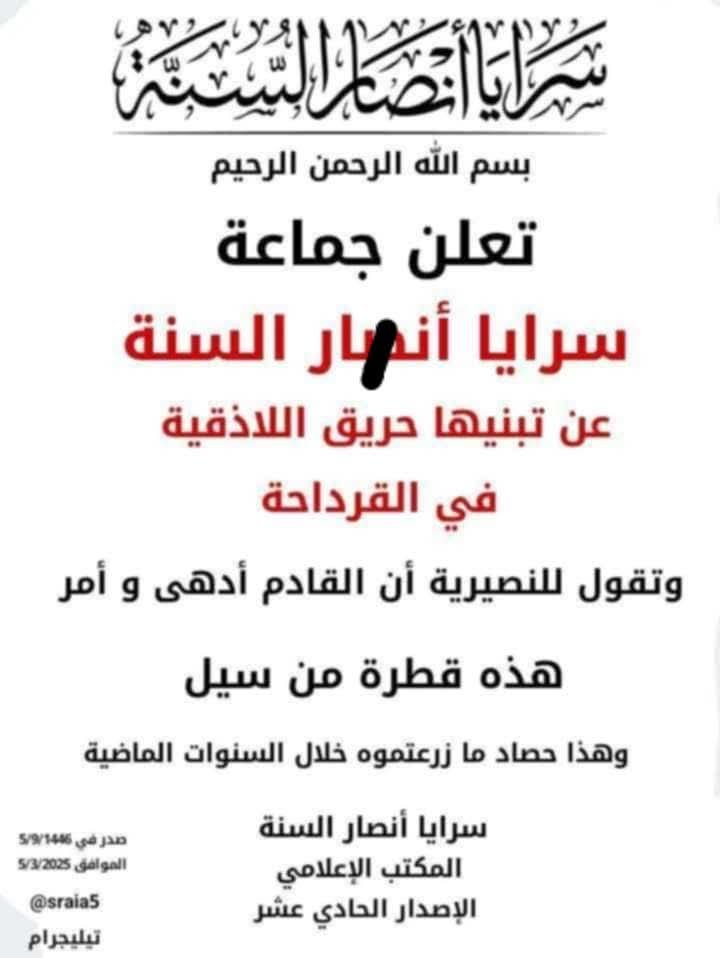 Eli kanlı, faşist, halk düşmanı cihatçı Ensar el-Sünne örgütü, Lazkiye’de yangın çıkarma sorumluluğunu üstlendi ve Alevilere daha fazla zarar vermekle tehdit etti.