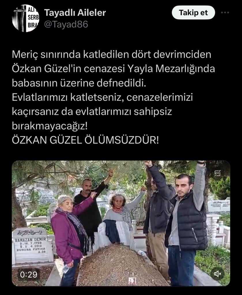 TAYAD’lı Ailelerin sosyal medya hesabından (X) yapılan açıklamada, “Meriç sınırında katledilen dört devrimciden Özkan Güzel’in cenazesi Yayla Mezarlığında babasının üzerine defnedildi.