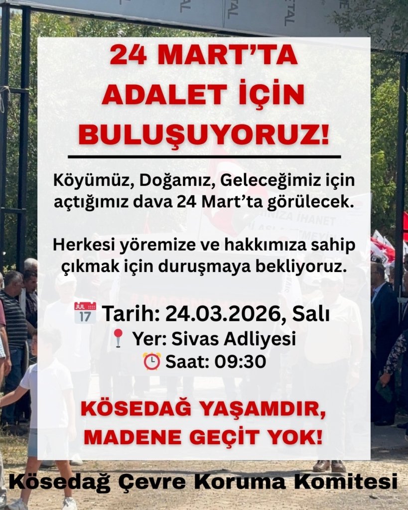 Kösedağ ekosisteminin ve Yeşilırmak’ı besleyen su kaynaklarının korunması için verilen bu mücadelede gözler şimdi yargıda. Şenyayla ve Çevirmehan köylüleri, 24 Mart Salı günü saat 09:30’da Sivas Adliyesi önünde tüm doğaseverleri ve basın emekçilerini dayanışmaya davet ediyor.