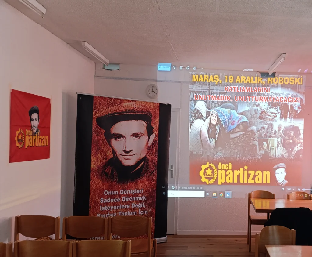 Zürih’te “Maraş, 19 Aralık, Roboski Katliamlarını Unutmadık, Unutturmayacağız!” şiarıyla bir anma etkinliği düzenlendi. Anma etkinliği, Öncü Partizan Zürih Komitesi’nden bir yoldaşın kısa açıklamasının ardından, devrim, komünizm ve demokrasi mücadelesinde ölümsüzleşenler anısına bir dakikalık saygı duruşuyla başladı ve 19 Aralık Katliamı’nı yaşayan tanıkların konuşmalarıyla devam etti.